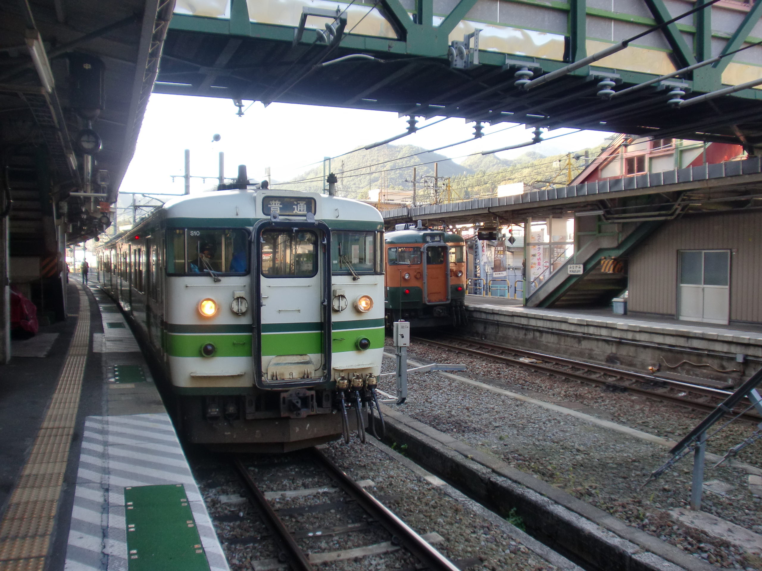 水上駅に停車中の115系電車(新潟色と湘南色)です。