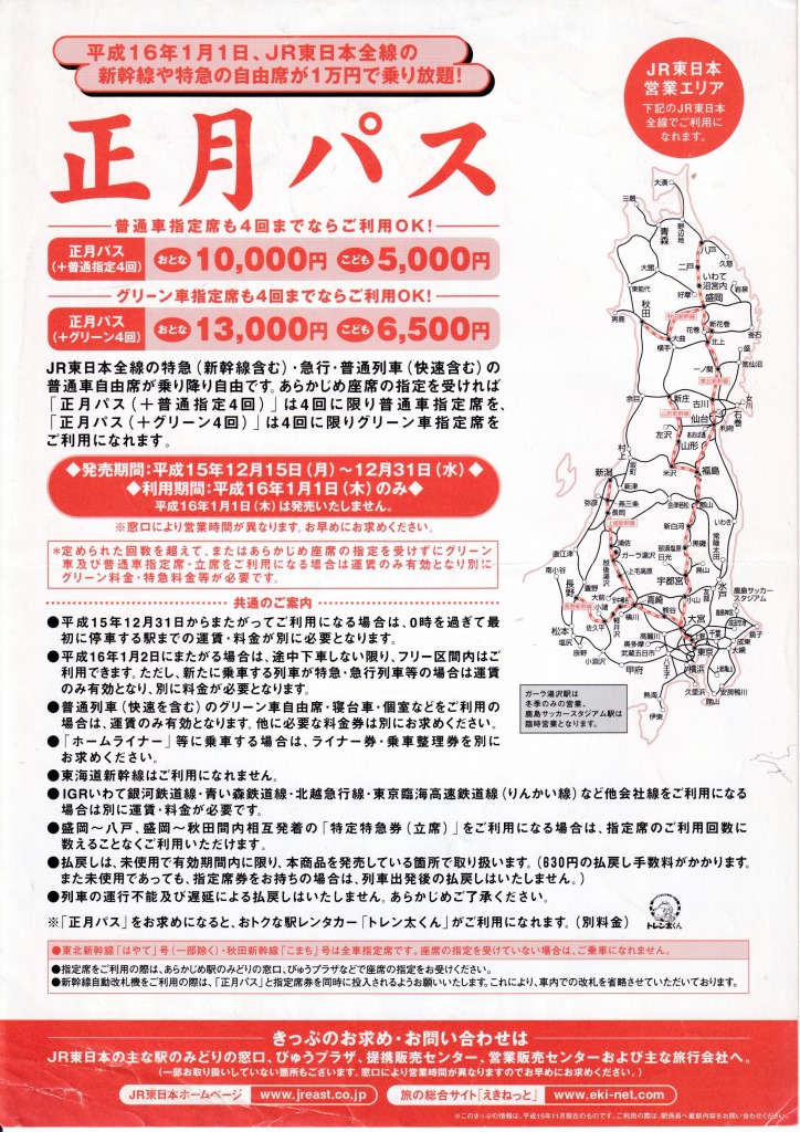 JR東日本の、2004年(平成16年)正月パス発売のパンフレットをご紹介いたします。