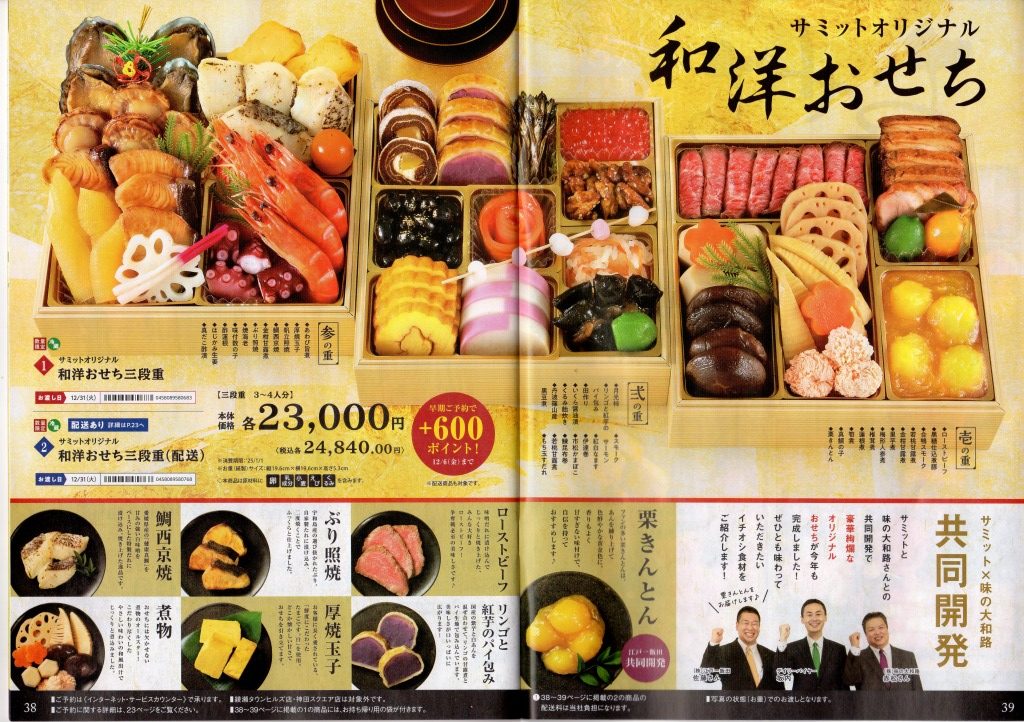 サミットの2024年版クリスマスケーキカタログと、2025年版おせち料理カタログです。(両面仕様)