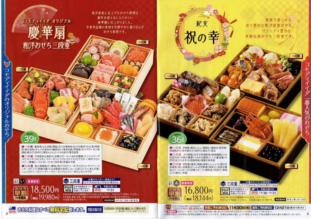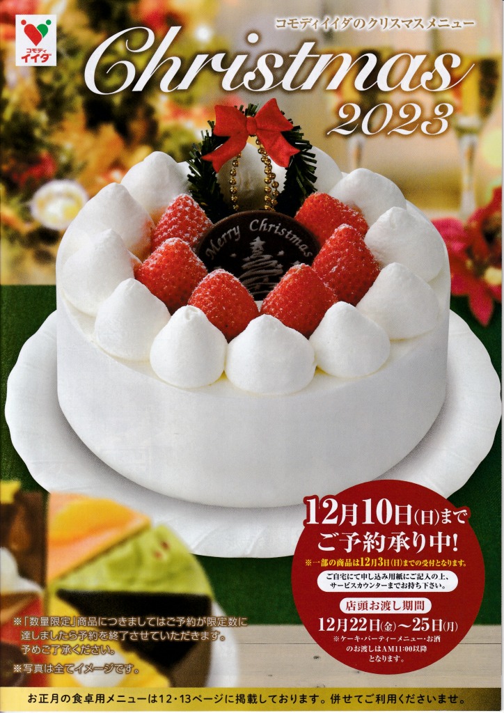 スーパーマーケット「コモディイイダ」の、2023年(令和5年)版クリスマスケーキ・2024年(令和6年)版おせち料理カタログの表紙をご紹介いたします。