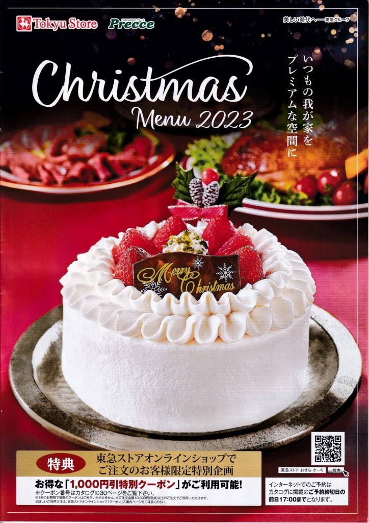 - 東急ストアの2023年版クリスマスケーキカタログと、2024年版おせち料理カタログです。(両面仕様)
