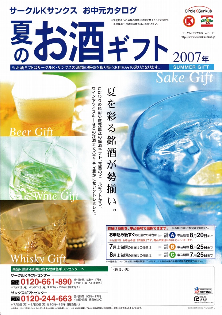 概要 大手コンビニチェーン「サークルKサンクス」の、お中元とお歳暮カタログの表紙を展示していきます。 2008 サークルKサンクスのお中元 表紙・裏表紙 タイトル:2008 サークルKサンクスのお中元発行:サークルKサンクスサイズ:A4 サークルKサンクスの2008年版お中元カタログです。 2007 サークルKサンクスのお中元 表紙・裏表紙 タイトル:2007 サークルKサンクスのお中元発行:サークルKサンクスサイズ:A4 サークルKサンクスの2007年版お中元カタログです。 関連記事 ローソンストア100のお中元・お歳暮カタログを集めてみました【パンフレット・デザイン考】 ゆずコレ◆東急ストア お中元・お歳暮カタログ / パンフレット デザイン展 ゆずコレ◆東武ストア お中元・お歳暮カタログ / パンフレット デザイン展 ゆずコレ◆セブンイレブン 2022年版 恵方巻 パンフレット