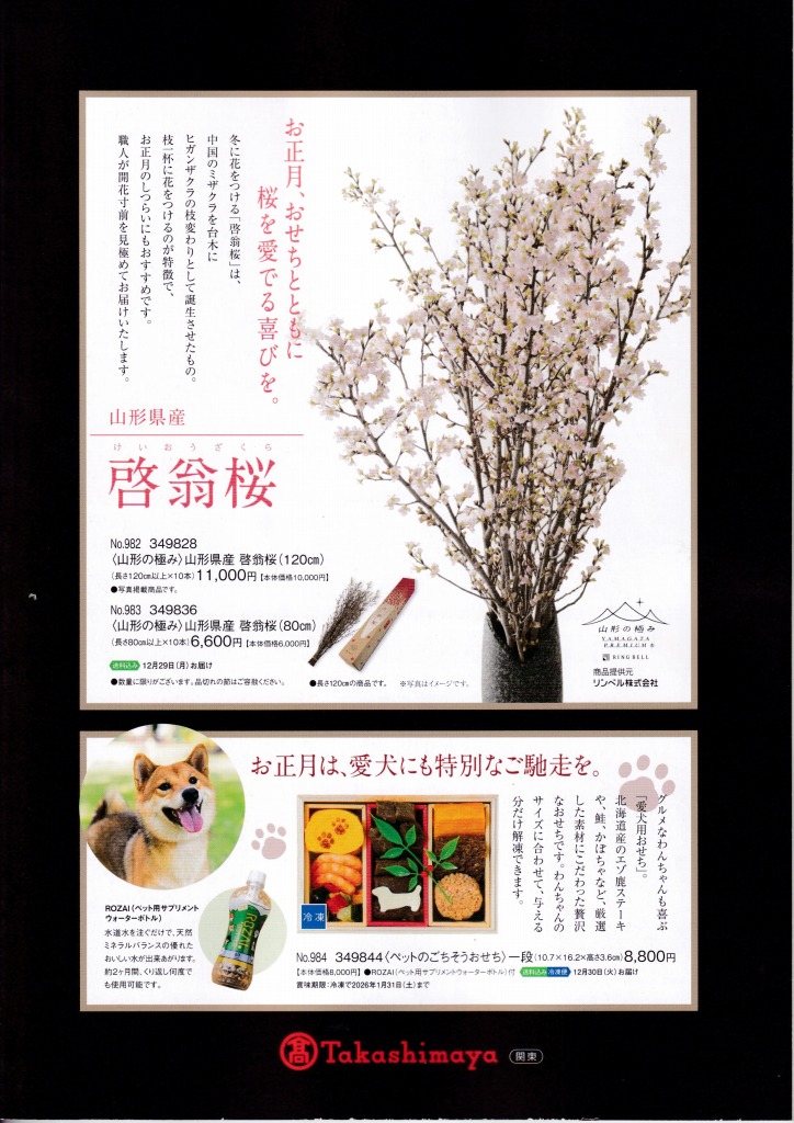 デパート「髙島屋」の、2026年(令和8年)版おせち料理カタログ(関東地区版)の表紙を紹介いたします。