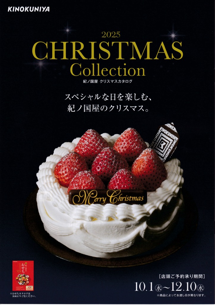 スーパーマーケット「紀ノ国屋」の、2025年(令和7年)版おせち料理・2024年(令和6年)版クリスマスケーキカタログの表紙をご紹介いたします。